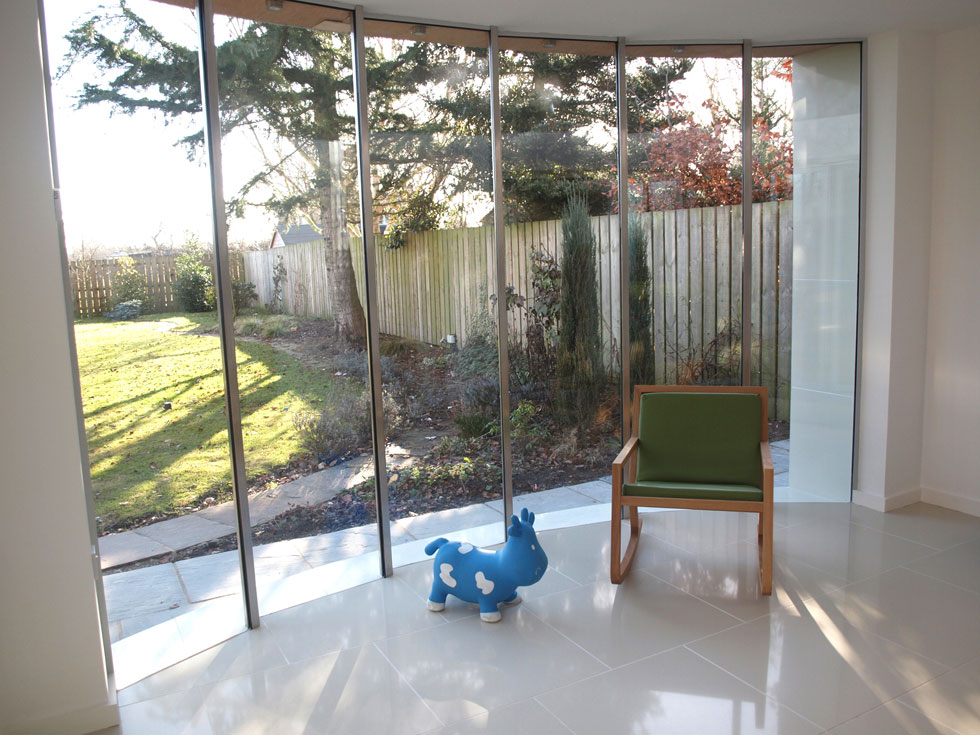 An unexpected and exceptional series of additions to a standard house. A bow-fronted garden room, a glass storm porch and modifications to the front facade house have provided high-quality space and added a new dimension to a simple modern house. The garden room in particular is a complex architectural statement, incorporating a faceted glass curve, a living roof and glazed brick walls.