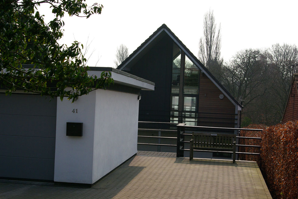 A bold project that provides contrast and variety while fitting in to an otherwise quite uniform area. A large volume of living space under a steep roof is approached by a bridge over a sunken garden. Unusually, the bedrooms are on a lower floor but privacy is managed by a skilful use of the falling levels on the site. The design makes careful use of modern materials and large areas of glass to create an unusual but striking house.